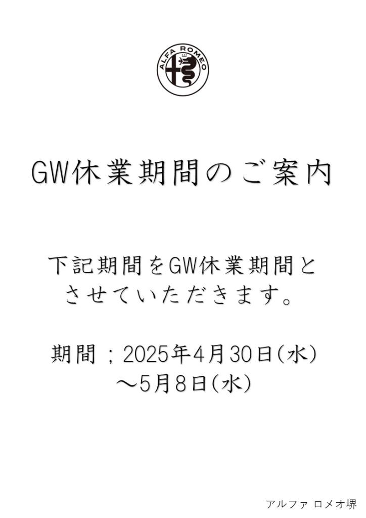 ※休業期間中のお車のトラブルは下記アルファ ロメオ ロードサービスをご利用ください。